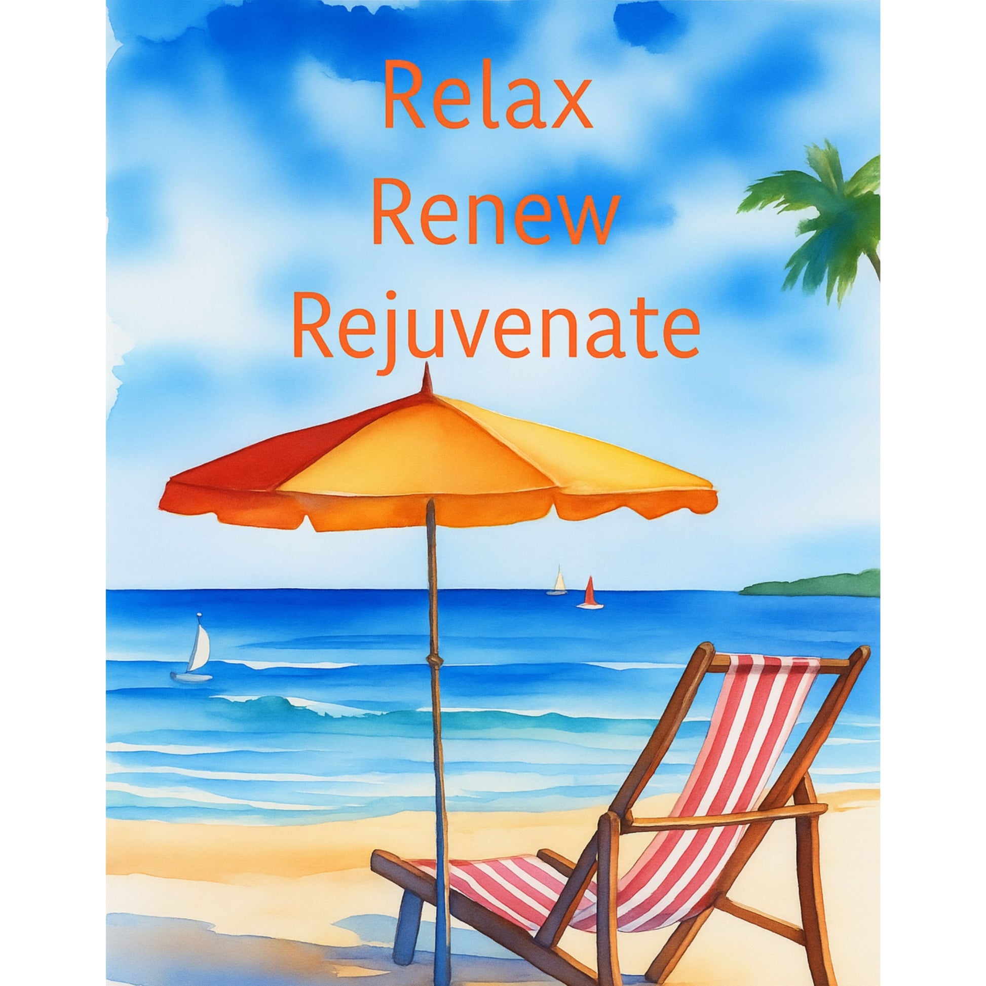 Bring a peaceful touch of the coast into your home with this vibrant seaside watercolor print featuring the gentle reminder: Relax, Renew, Rejuvenate.